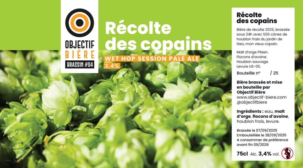 En ce mois de septembre 2025, je me suis souvenu que Geo, mon vieux copain, avait du houblon sauvage dans son jardin. Quelques SMS plus tard, la date de la récolte était fixée. Et une ébauche de recette de bière de récolte était préparé dans la foulée. Ce sera une Pale Ale, volontairement à un faible degré d’alcool (donc Session), avec du houblon frais (donc Wet Hop).