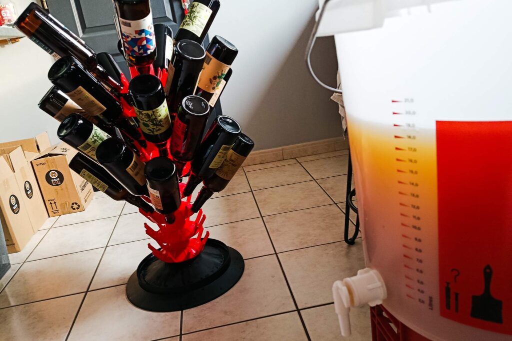 Trois semaines plus tard, après avoir surveillé la densité finale qui stagnait à 1011, c’est le moment d’embouteiller ! Petite amélioration pour le mélange avec le sirop de sucre : on ouvre la vanne du tire-au-clair à fond pour bien remuer le sirop au fond du seau, tout en gardant le bout du tuyau sous la surface pour éviter les remous.