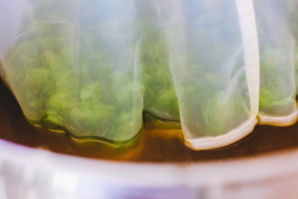 Aujourd’hui, le houblonnage est un peu particulier. Beaucoup de brasseurs m’ont conseillé de faire un hop stand pour ce type de recette au houblon frais. Donc après la fin de l’ébullition et le whirlpool, je mets le sac de cônes de houblons frais dans la cuve qui est maintenant à 78°C.